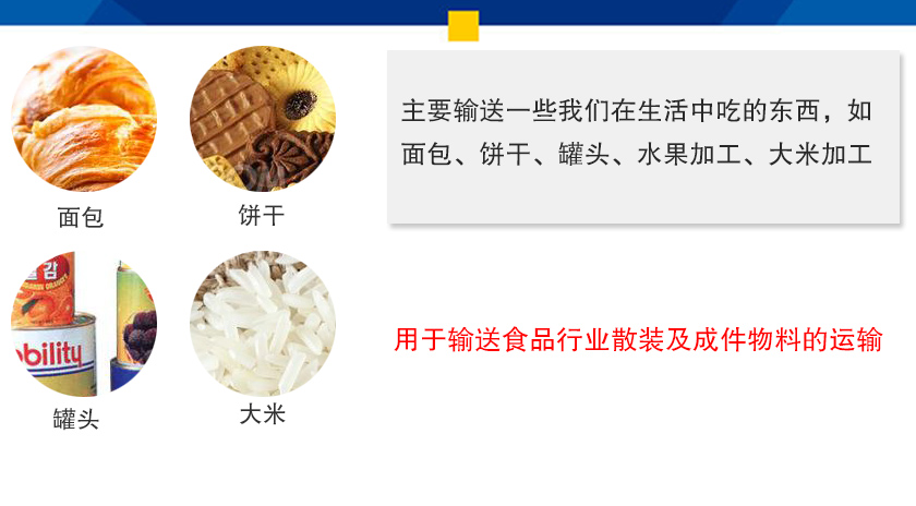 食品皮帶輸送機(jī)主要輸送一些我們?cè)谏钪谐缘臇|西,如面包、餅干、罐頭、水果加工、大米加工等。