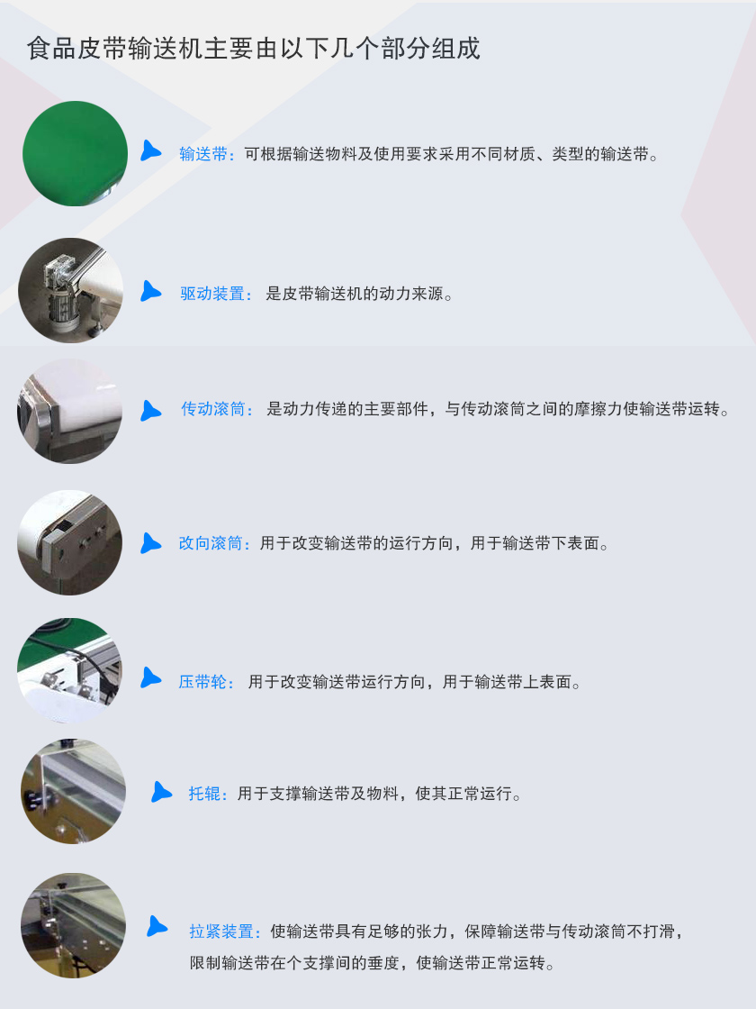 食品皮帶輸送機(jī)主要由以下幾個(gè)部分組成: