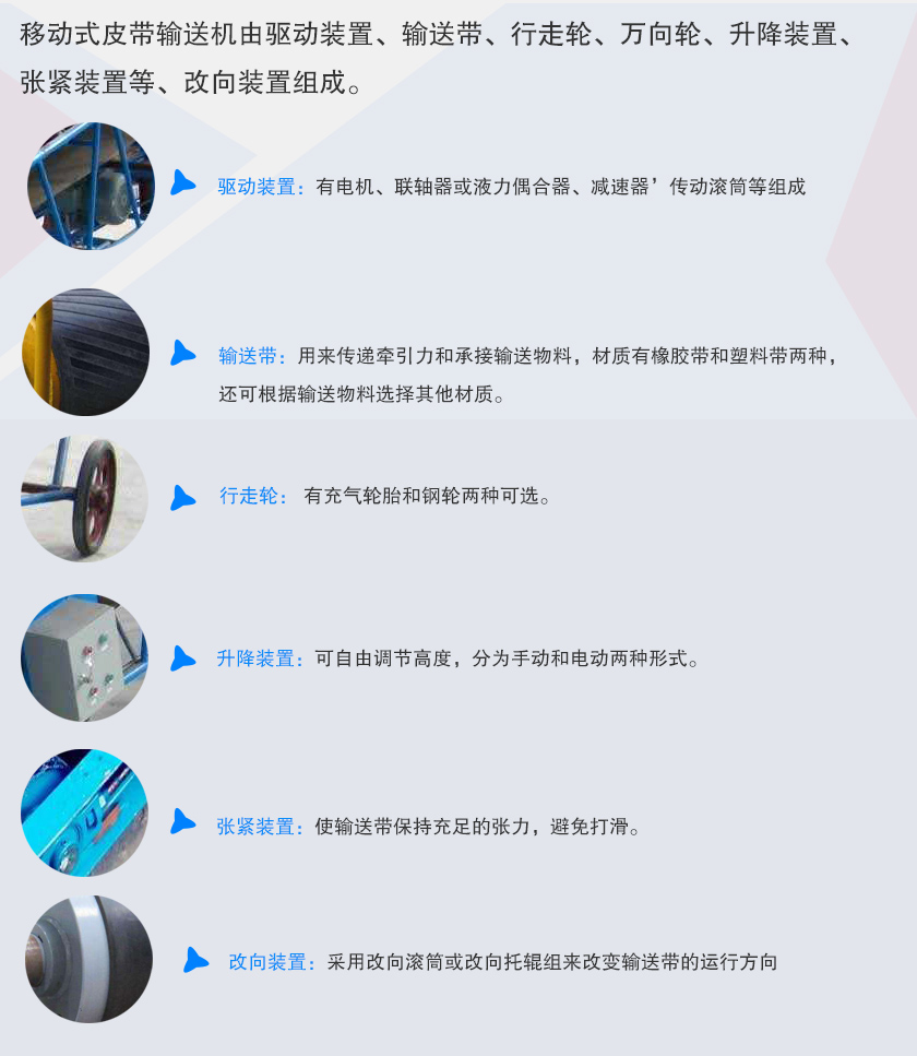 移動式皮帶輸送機由驅動裝置、輸送帶、行走輪、萬向輪、升降裝置、張緊裝置等、改向裝置組成。