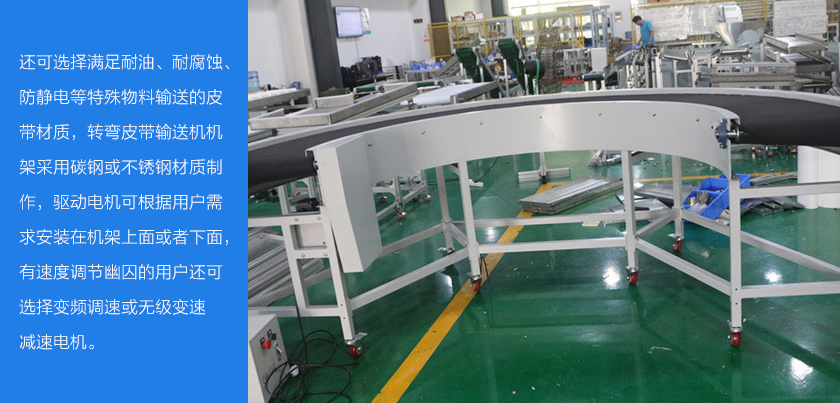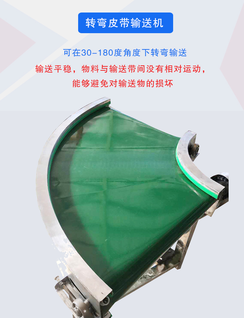 轉彎皮帶輸送機簡稱轉彎皮帶機可30°,45°,90°和180°輸送物料,轉彎皮帶輸送機輸送帶可根據輸送物料的性質選擇PVC、PU材質,除輸送普通物料外,還可選擇滿足耐油、耐腐蝕、防靜電等特殊物料輸送的皮帶材質.