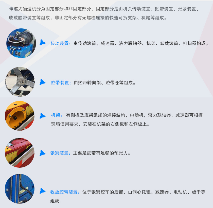 伸縮式輸送機分為固定部分和非固定部分,固定部分是由機頭傳動裝置、貯帶裝置、張緊裝置、收放膠帶裝置等組成,非固定部分有無螺栓連接的快速可拆支架、機尾等組成。